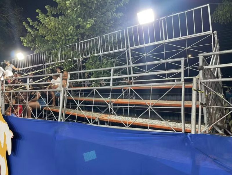 Uma das arquibancadas montadas para o Carnaval Tradição, na Avenida Duarte da Silveira, em João Pessoa, apresentou problemas estruturais e cedeu na noite desta segunda-feira (16).
