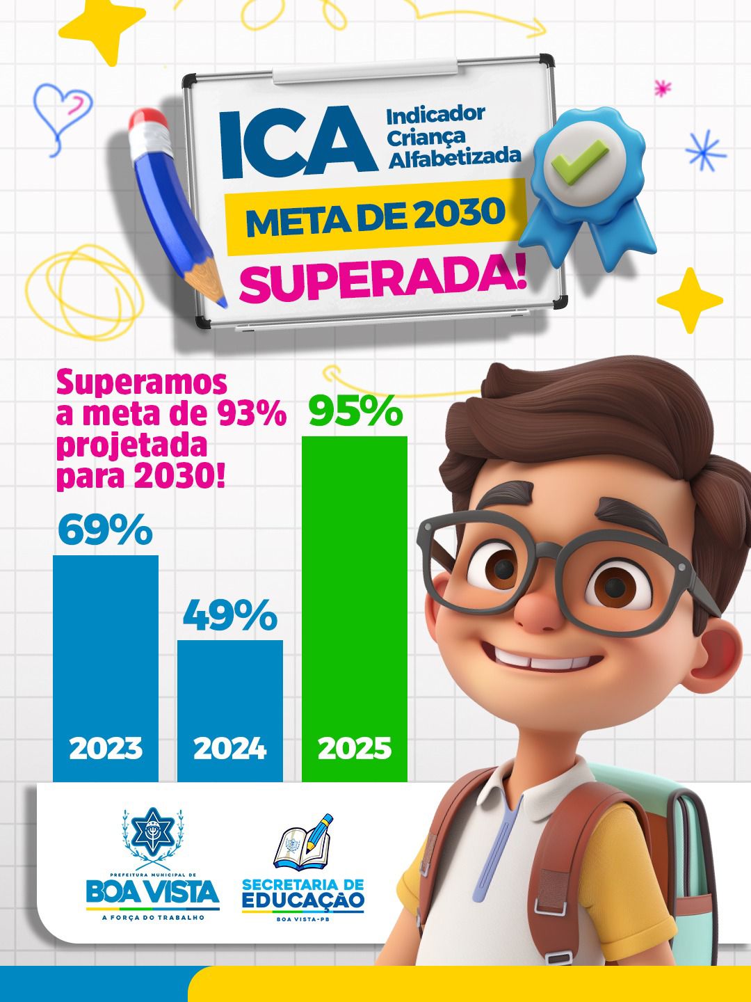 O município de Boa Vista alcançou um resultado expressivo no Indicador Criança Alfabetizada (ICA), divulgado pelo Instituto Nacional de Estudos e Pesquisas Educacionais Anísio Teixeira (Inep), ao registrar um crescimento significativo no nível de alfabetização das crianças na rede municipal de ensino. Os dados mostram uma evolução consistente ao longo dos últimos anos, saindo de 69% em 2023, passando por 49% em 2024 e atingindo 95% em 2025, índice que supera a meta projetada para 2030, que era de 93%.