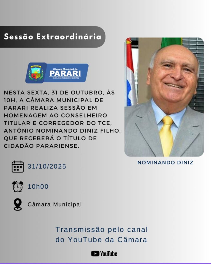 A Câmara Municipal de Parari realizará, nesta sexta-feira (31 de outubro), a partir das 10h, uma sessão extraordinária em homenagem ao conselheiro titular e corregedor do Tribunal de Contas do Estado da Paraíba (TCE-PB), Antônio Nominando Diniz Filho.