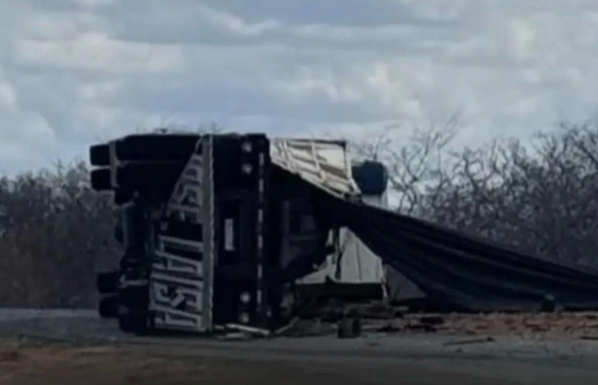 Uma carreta tombou na tarde desta quarta-feira (14) na rodovia estadual PB-200, no trecho que liga os municípios de Serra Branca e Parari, no Cariri paraibano.