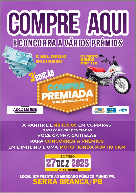 O comércio de Serra Branca se prepara para celebrar o fim de ano com a 3ª edição do Compra Premiada Serra Branca, campanha que promete movimentar a economia local e fortalecer a relação entre comerciantes e consumidores. Organizado pela ASCOMSESB – Associação dos Comerciantes e Serviços de Serra Branca, o evento chega com novidades, prêmios em dinheiro e o sorteio de uma moto Pop 110 zero km.