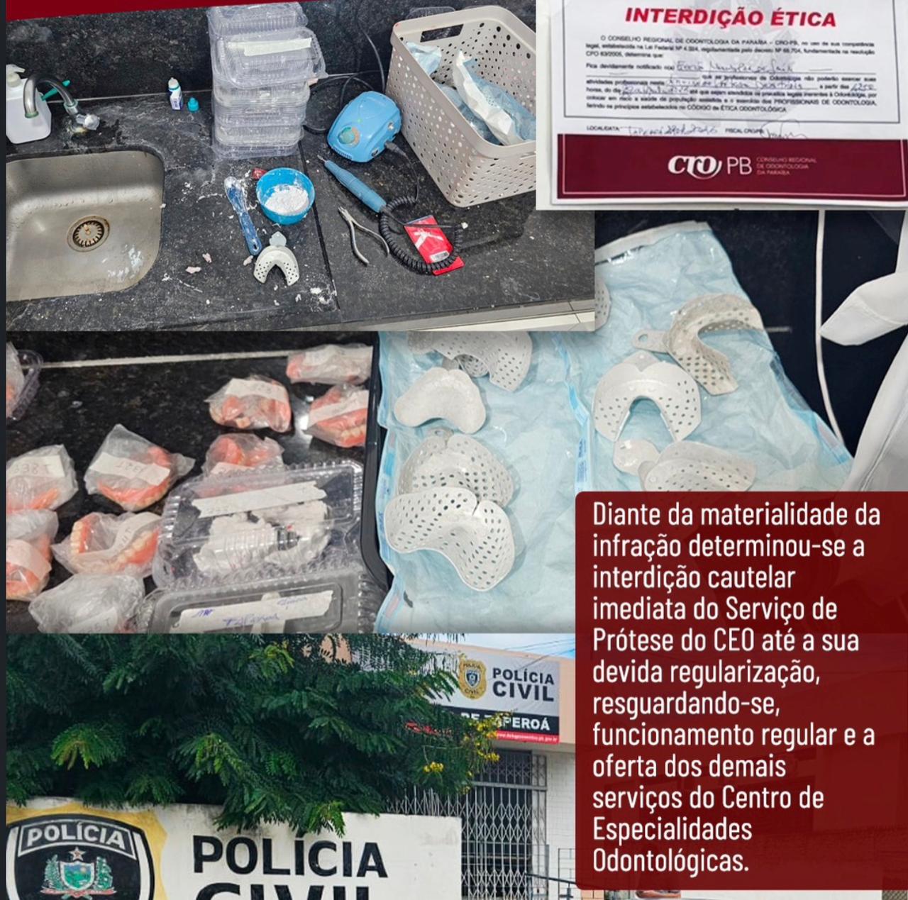De acordo com a publicação do órgão, a medida foi adotada após diligência realizada pela equipe da Delegacia Regional de Patos na última quarta-feira (22). Durante a inspeção, foi identificado um Técnico em Prótese Dentária (TPD) atuando de forma autônoma dentro da sala clínica odontológica, o que configura infração ao Artigo 4º da Lei Federal nº 6.710/1979.