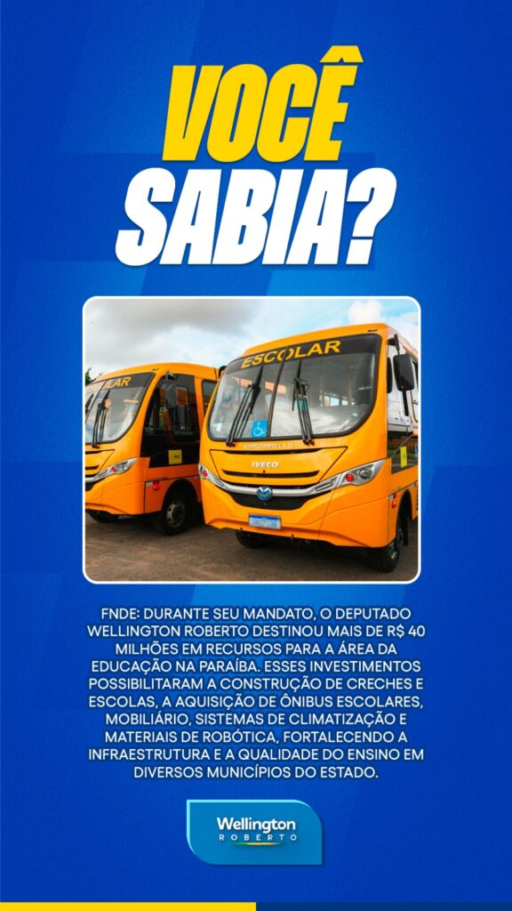 A educação da Paraíba tem sido amplamente beneficiada pelos investimentos destinados ao longo do mandato do deputado federal Wellington Roberto. Por meio do Fundo Nacional de Desenvolvimento da Educação (FNDE), o parlamentar já destinou mais de R$ 40 milhões em recursos para municípios de todas as regiões do estado, consolidando uma das maiores atuações parlamentares em prol da educação pública paraibana.