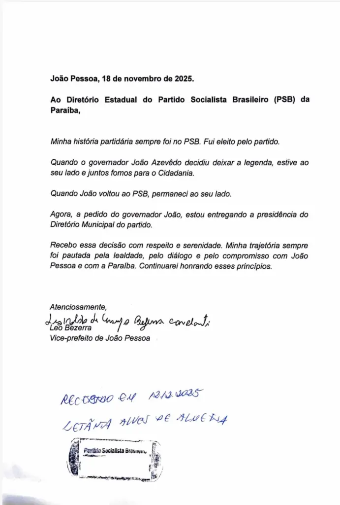 Em sua carta, Leo reafirma lealdade e alinhamento político com o governador, lembrando que acompanhou João Azevêdo tanto na saída do PSB para o Cidadania quanto em seu retorno ao partido. “Agora, a pedido do governador, estou entregando a presidência do Diretório Municipal do partido”, escreveu.