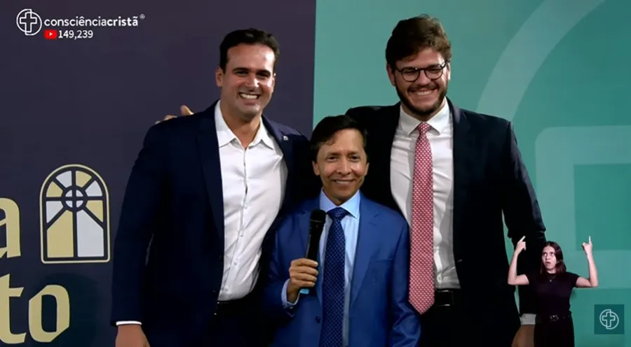 O prefeito de Campina Grande, Bruno Cunha Lima (União), e o vice-governador, Lucas Ribeiro (PP), oraram juntos durante a abertura do Encontro Para a Consciência Cristã, nesta quinta-feira (12), em Campina Grande, evento que integra o ‘Carnaval da Paz’.