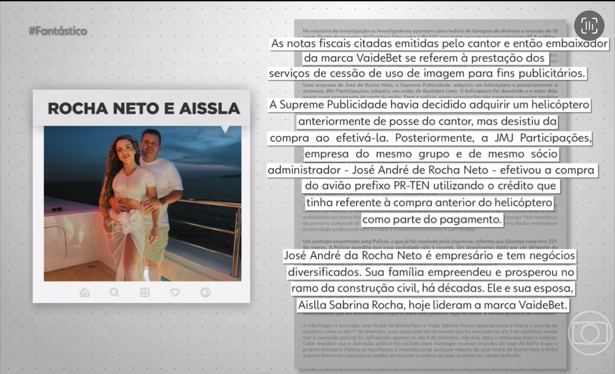 A defesa de Gusttavo Lima enviou uma nota ao Fantástico informando que o contrato com a PIX365 tinha cláusula anticorrupção e foi suspenso. E sobre a venda das aeronaves, diz que os contratos foram feitos em nome das empresas com os seus representantes legais, o que afasta a possibilidade de lavagem de dinheiro.