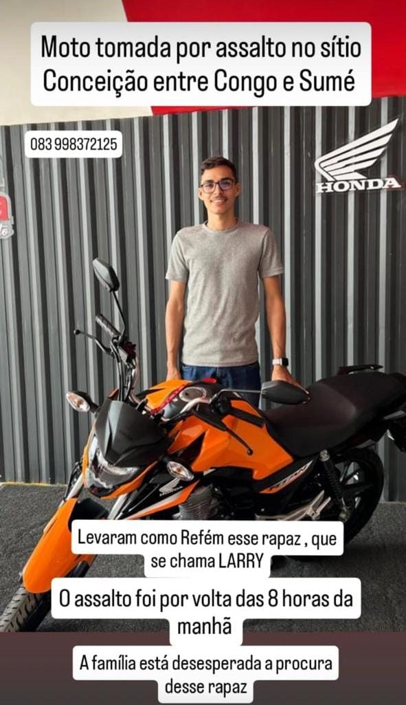 A Polícia foi acionada e o caso deverá ser investigado pelas forças de segurança da região. Informações que possam ajudar na localização da vítima ou da motocicleta podem ser repassadas às autoridades policiais ou por meio do telefone (83) 99837-2125.