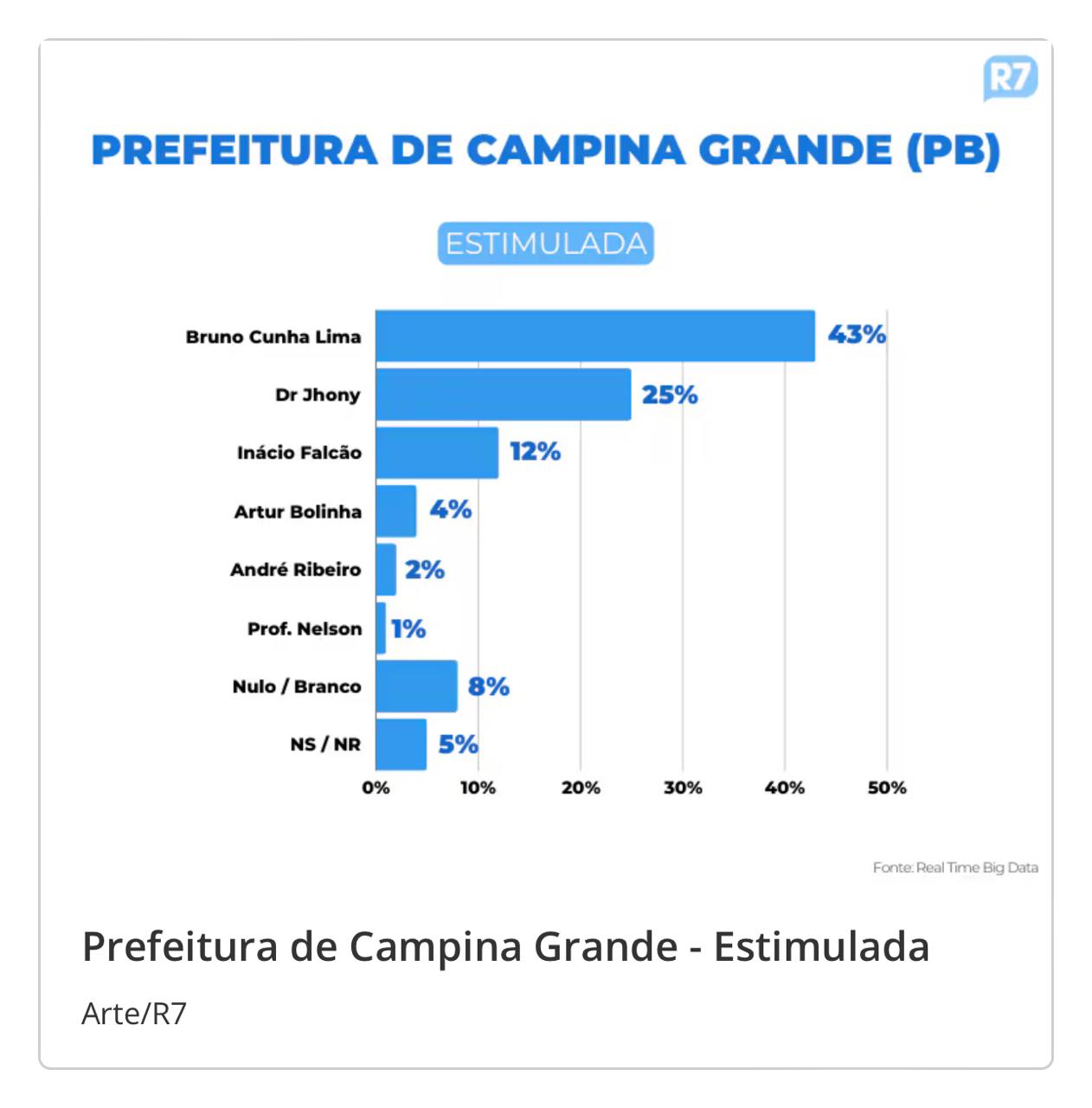 A pesquisa do instituto Real Time Big Data, divulgada nesta quinta-feira (3), aponta que a eleição para a Prefeitura de Campina Grande caminha para um segundo turno. Segundo os números, o atual prefeito Bruno Cunha Lima (União Brasil) lidera com 43% das intenções de voto, seguido por Dr. Jhony (PSB) com 25%, no cenário estimulado.