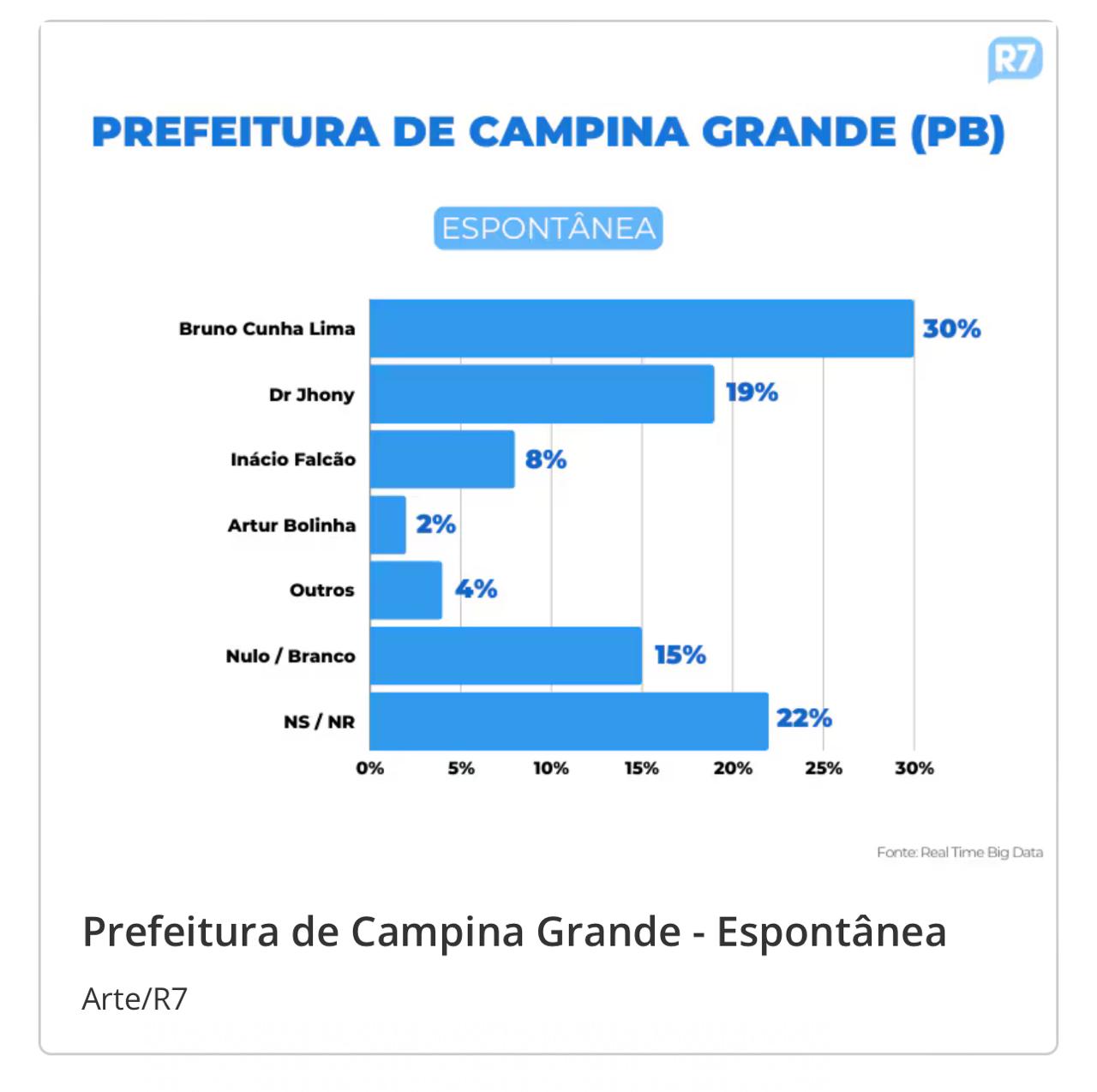 No cenário espontâneo, onde os nomes dos candidatos não são apresentados, Bruno Cunha Lima aparece com 30% das intenções de voto, enquanto Dr. Jhony registra 19%. Esses números reforçam a possibilidade de segundo turno em Campina Grande, já que nenhum dos candidatos atinge a maioria absoluta dos votos necessários para vencer no primeiro turno.