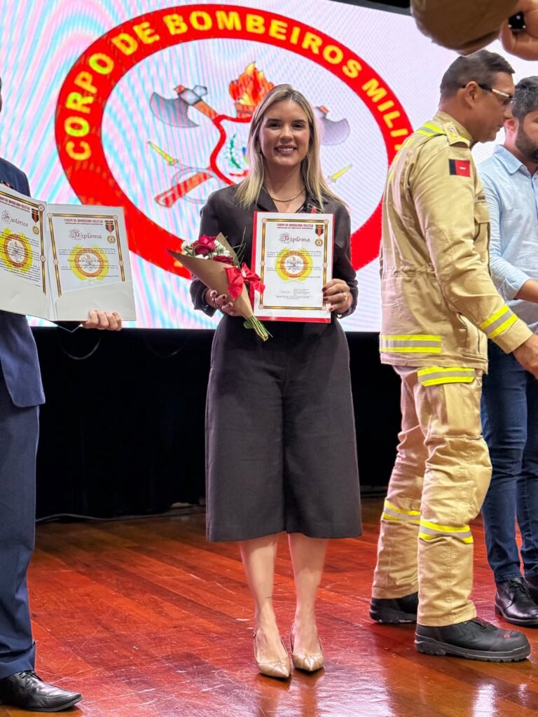 Durante a solenidade, a gestora foi agraciada com a Medalha de Serviços Distintos, honraria concedida a personalidades que contribuem de forma significativa para o fortalecimento institucional e para o apoio às ações do Corpo de Bombeiros. O reconhecimento destaca a parceria construída ao longo da gestão e o compromisso da administração municipal com a valorização das forças de segurança e salvamento.