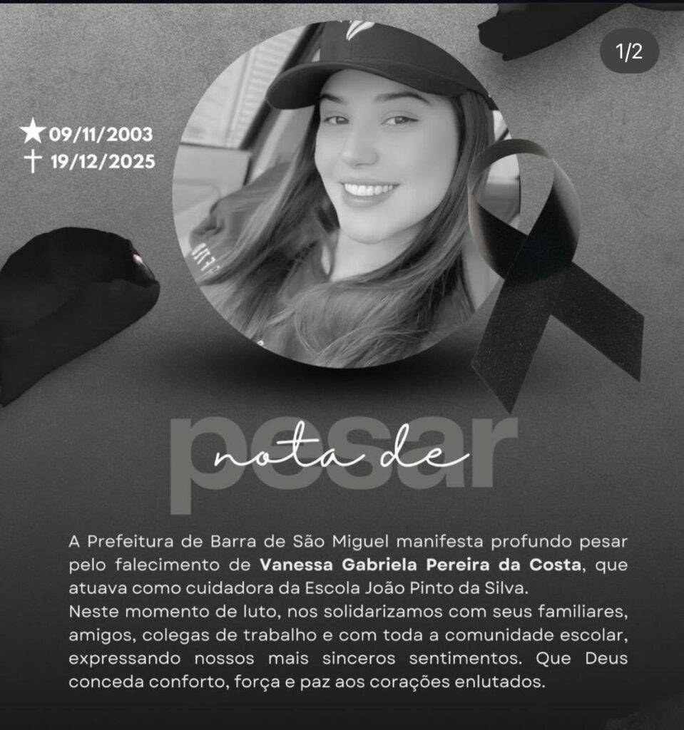 A Prefeitura de Barra de São Miguel se solidariza com todos os familiares, amigos e colegas de trabalho de Vanessa Gabriela, reafirmando sentimentos de pesar e respeito diante desta irreparável perda.
