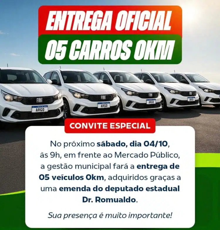 A Prefeitura de Caraúbas, através do prefeito Nerivan, anunciou a entrega oficial de cinco veículos 0km conquistados por meio de emenda do deputado estadual Dr. Romualdo. A solenidade acontecerá no próximo sábado (04), a partir das 9h, em frente ao Mercado Público, e contará com a presença da população e autoridades locais.