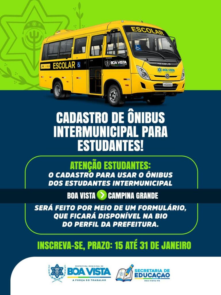 A Prefeitura Municipal de Boa Vista, na Paraíba abriu cadastro para o transporte escolar intermunicipal. A iniciativa, coordenada pela Secretaria Municipal de Educação, visa garantir que os estudantes que residem na cidade e cursam o ensino técnico, superior e em escolas de Campina Grande tenham acesso gratuito e seguro ao deslocamento diário.