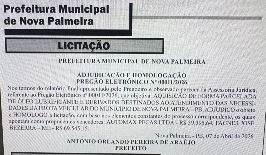 EXCLUSIVO – A Prefeitura Municipal de Nova Palmeira publicou, em diário oficial, a adjudicação e homologação do Pregão Eletrônico nº 00011/2026, que trata da aquisição parcelada de óleo lubrificante e derivados destinados à manutenção da frota de veículos do município.