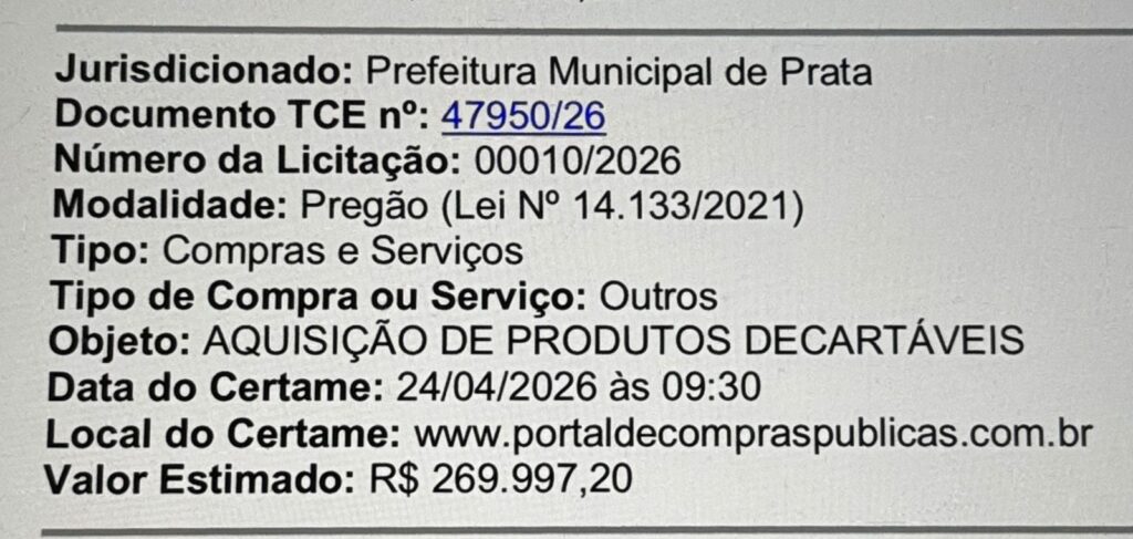 A Prefeitura Municipal de Prata, sob o comando do prefeito Genivaldo Temborio lançou um novo processo licitatório visando a aquisição de produtos descartáveis para atender às demandas da administração pública.