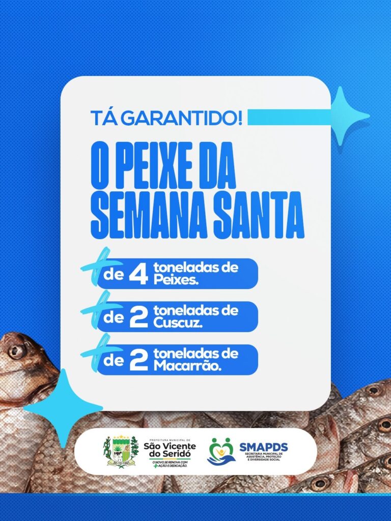 “É uma ação que já faz parte da nossa tradição e que realizamos com muito compromisso e respeito às famílias de São Vicente do Seridó. Garantir o peixe da Semana Santa é levar dignidade à mesa do nosso povo, principalmente para quem mais precisa”, afirmou o gestor.