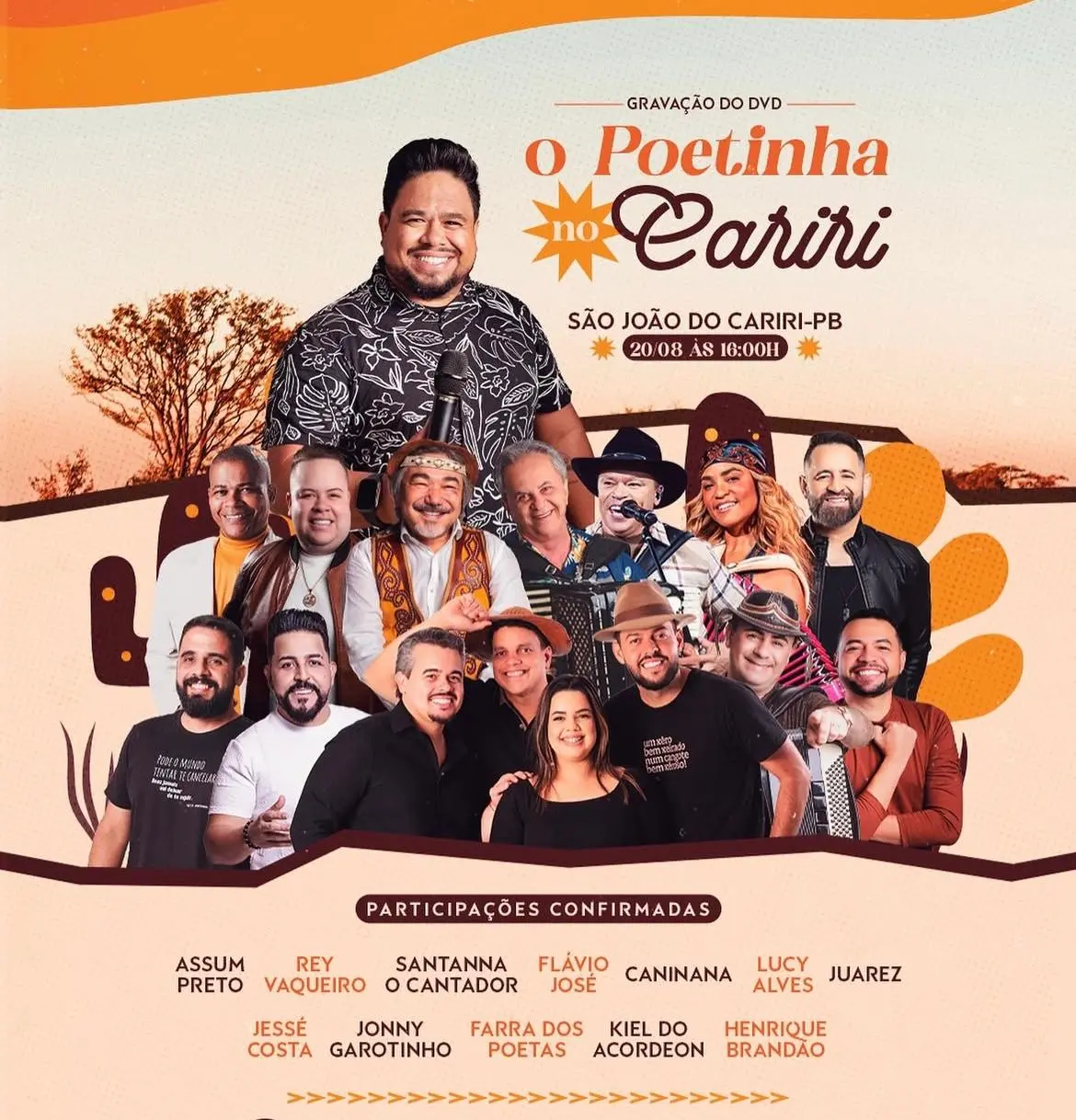 O cantor e compositor Raphael Moura, conhecido como O Poetinha, anunciou oficialmente as atrações que farão parte da gravação do seu novo DVD, que acontecerá no dia 20 de agosto, às 16h, na cidade de São João do Cariri. O evento será totalmente gratuito e promete ser um dos maiores espetáculos já realizados no Cariri paraibano.