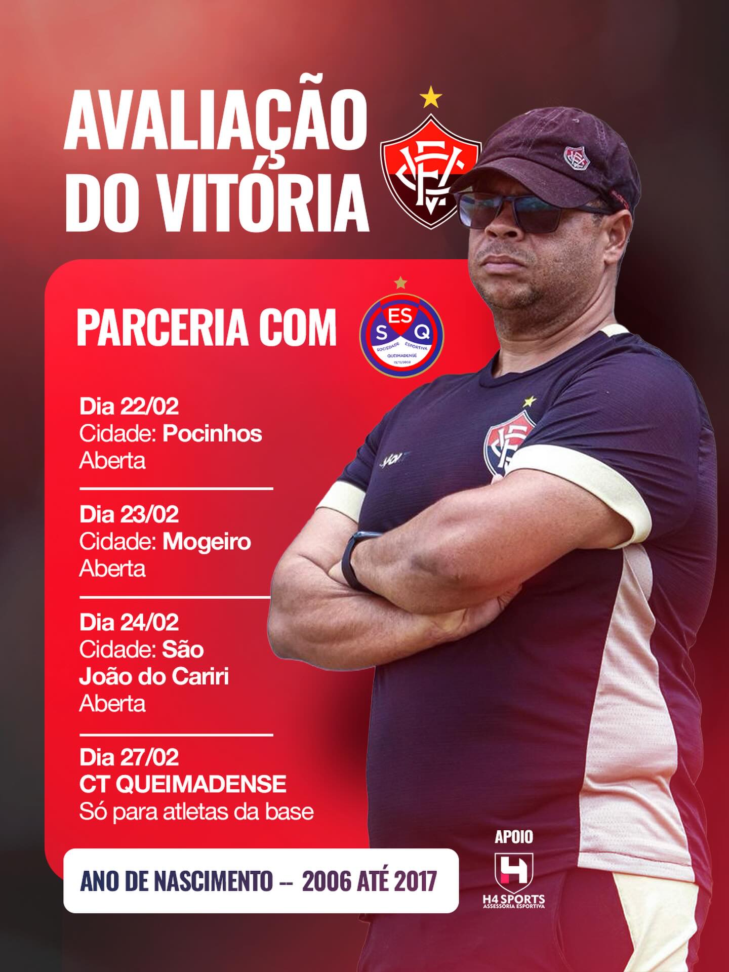 A avaliação em São João do Cariri está marcada para o dia 24 de fevereiro e será coordenada pelo observador técnico Leandro Fernandes, responsável por analisar o desempenho dos participantes e selecionar possíveis promessas para futuras oportunidades nas categorias de base do clube baiano.