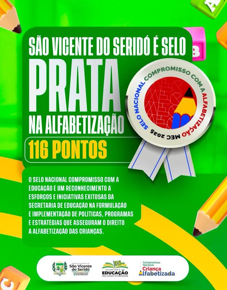 O município de São Vicente do Seridó alcançou o Selo Prata no programa nacional de compromisso com a alfabetização, somando 116 pontos na avaliação que reconhece boas práticas e resultados na área educacional. O selo é concedido a redes de ensino que demonstram avanços consistentes na formulação e implementação de políticas, programas e estratégias voltadas à alfabetização das crianças.