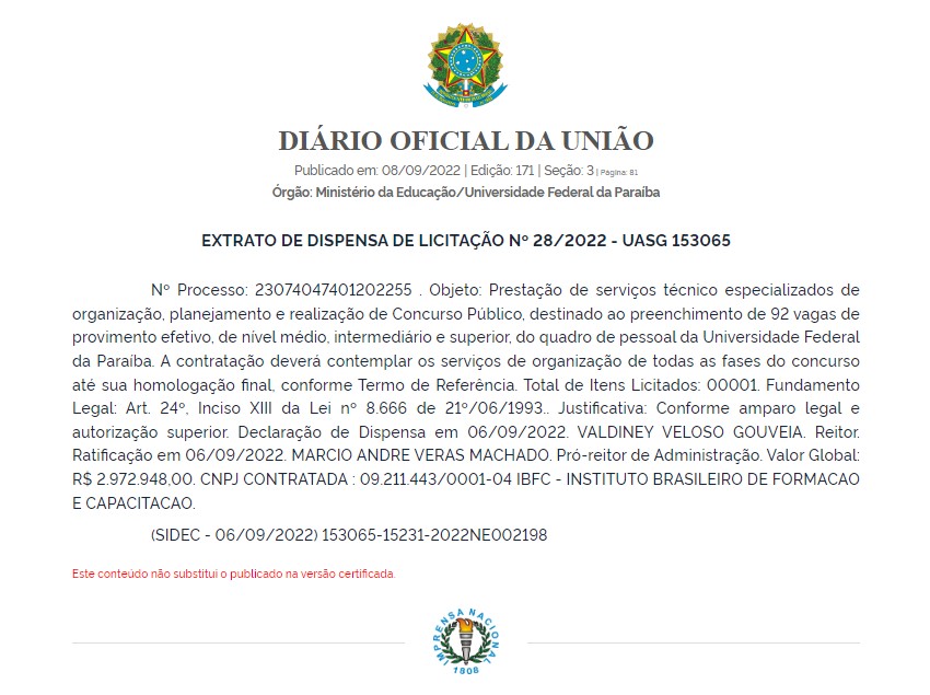 A Universidade Federal da Paraíba (UFPB) contratou a banca organizadora que vai gerenciar o novo concurso da instituição. O extrato de dispensa de licitação, com valor de R$ 2,9 milhões, foi publicado no Diário Oficial da União (DOU), nesta quinta-feira (8).